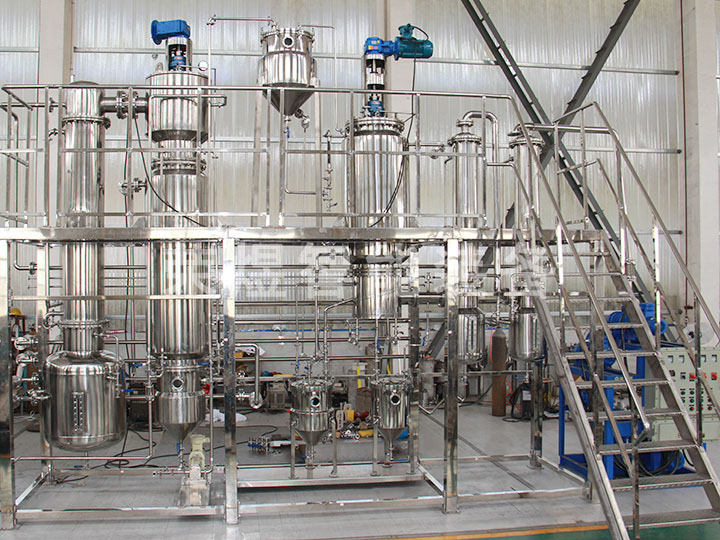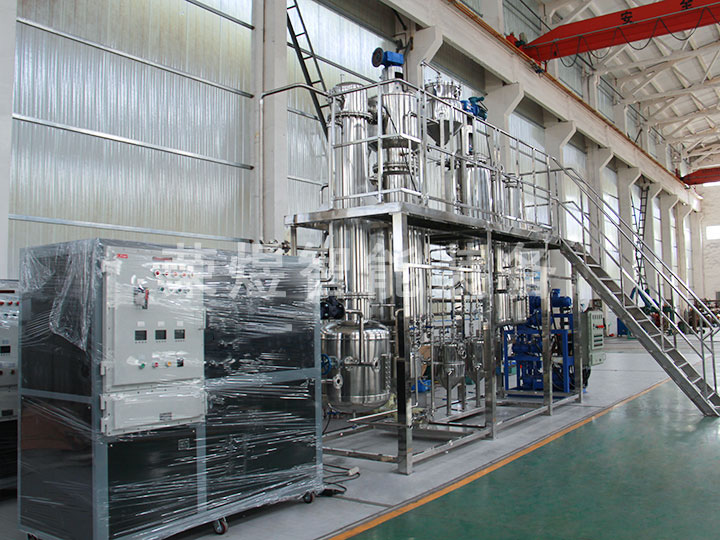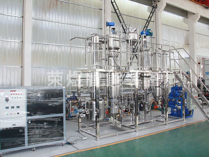 結(jié)構(gòu):本設(shè)備主要包括薄膜蒸發(fā)器、一級冷凝器、二級冷凝器、原料罐、成品罐、低沸點(diǎn)罐、高沸點(diǎn)罐等部件組成,全部由不銹鋼制造。